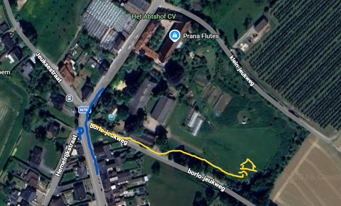 Onze ingang is een beetje verscholen. Volg het gele wegje op de foto. In het echt is dit ongeveer 100 meter de Borlo-jeukweg volgen en dan nog eens 100 meter een klein graspadje omhoog langs een paardewei. De ingang van het graspadje is net na de schuur en een grindweg en er staat een zwarte pijl met “Leliehof” op, om je de weg te wijzen.